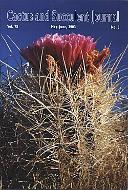 Although normally clothed in a mixture of red and white spines, the specimen on the cover is entirely white-spined. Rob Skillin of Bakersfield, California, took the photo in the El Paso Mountains of California. His photo of the varicolored form - growing at the same locality - was featured on the cover of Haseltonia 7. |