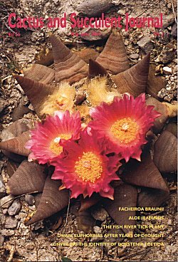 | Cover illustration: Ariocarpus retusus is one of the most widely distributed, and the most variable species of the genus. Plants growing in the area of Aramberri, Mexico in the state of Nuevo Leon, have attracted special attention for even greater variability within the individual colonies. The plant illustrated on the cover (photographed by Rob Skillin in the fall of 1995) comes from a colony east of town where vegetative characteristics range from classic retusus (broad, blunt, gray-green tubercles) to forms more suggestive of trigonus (long, sharply pointed, yellow-green, incurving tubercles). Plants may or may not have an areolar pad on the tips or their tubercles. Flower color just adds to the confusion: the retusus-like plants have deep pink flowers, as pictured, not the expected white, while trigonus-like plants have white flowers with none exhibiting the expected yellow. Such mixed characteristics have led to the speculation that these colonies are natural hybrid swarms, which has contributed to the submerging of A. trigonus as a subspecies of A. retusus. |