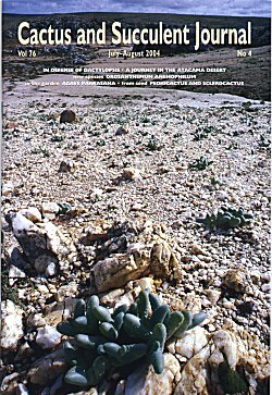 | Cover illustration: The Knersvlakte is a small portion of Namaqualand somewhat inland of the western coast of South Africa. It is renowned for its quartz fields - plains of white quartzitic pebbles which blanket the surface of the earth like hail after a Midwestern thunderstorm. Within these fields grows a great diversity of dwarf flowering stones, especially leaf succulents of the Crassula and Mesemb families. The mesemb genera Argyroderma, Oophytum, and Dactylopsis are endemic to this area, growing exclusively on quartz. These miniatures often occur in such dense concentrations that they lend a green cast to the hillsides, growing shoulder to shoulder in carpet-like mats. As with many extremely arid regions, the Knersvlakte experiences great variability in rainfall, although the average is quite low. During the South African winter of 2001, unusually heavy rainfall saturated the ground and plumped the plants to the bursting point. Rob Skillin shot the cover photo of Dactylopsis digitata in August of that year, when the plants were so turgid with water that the leaf tips of many were popping off from the internal pressure. |