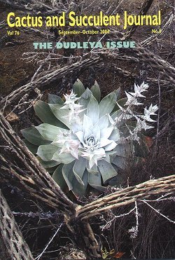 | Cover illustration: Framed by the remains of a cylindropuntia, Dudleya anthonyi finds home well-hidden in thick brush in the Socorro Canyon, Baja California Norte, Mexico. The strikingly farinose leaves and unusual size (38cm across) attracted the attention of the photographers, Julia Etter and Martin Kristen, during the early stage of flowering in May.