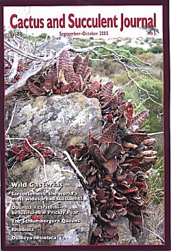 The Gasteria Bug hits some people so hard that they cross the globe to see them in their native habitat. Breck Breckenridge did just that after he won a CSSA Schwarz Travel Grant. In this issue he details his adventures with many fine photos and a story beginning on page 244. He also provided the picture on the cover of a large clustering specimen of Gasteria carinata variety carinata found on a farm near Caledon in the Western Cape of South Africa, where this species grows on shale above a dry watercourse. |