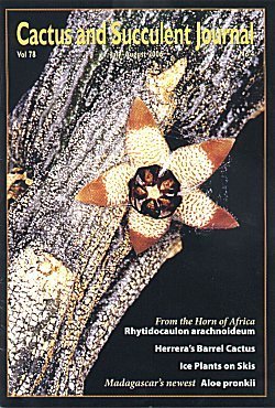 | Cover illustration: Rhytidocaulon arachnoideum, newly described in this issue, is unusual in many ways. Members of the genus Rhytidocaulon are strange and wonderful mimicry plants easily passed over as dead, so wrinkled and cryptically colored are their succulent stems. Nevertheless, local people often consume them as a fresh, vegetable snack! Being a member of the milkweed family, pollinators (likely tiny flies) are lured into a highly complex and efficient pollination ritual similar to what happens in orchids: an entire packet of pollen, called a pollinium, is surreptitiously latched onto a tiny hair of the pollinator's leg or body and then (hopefully) delivered to the next flower. Meanwhile the fly has been duped into searching for a place to lay its eggs - and gets nothing for its trouble. The flowers on this species are unique in having a delicate webbing that stretches from one petal (lobe) to the next - like a spider's web - lending the species its name. The function of the webbing is unclear, but once this plant is established in our collections it can be studied, and perhaps its purpose will be revealed. Photo by Tom McCoy. |
