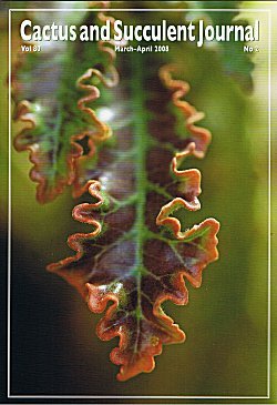 It's easy to see why, even unnamed, this plant attracts attention. Our cover, a photo by Out of Africa's Mike Massara, reveals leaves of this "new" dorstenia in fall color, just before they drop for a winter rest. And in this issue it finally receives a name: Dorstenia lavrani. |