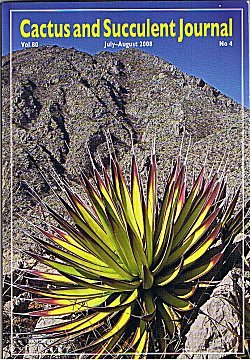 | On the cover: This beautiful specimen of Agave pelona was found growing on a craggy limestone ridge in the Sierra El Viejo, located in Sonora, Mexico, one of only four isolated mountain ranges where this species is known to occur. Among its many charms are long dagger-like leaf tips, an absence of teeth along the leaf margins, deep-red flowers, and the leaves' purple blush, which appears to be genetic, rather than drought induced. It and a companion plant at this site, Agave zebra, were observed on three recent trips (see page 170) conducted by Greg Starr, Brian Kemble, and Rob Nixon, who captured this image for our cover. |