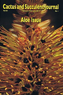 | On the cover: Duke Benadom photographed specimens of Aloe spicata (syn. A. sessiliflora) from several angles, including this close-up of a raceme, as it is an unusually-beautiful plant. He and Artie Chavez first encountered this taxon on a steep hillside in Swaziland, just a kilometer or two from the Mozambique border. It is one of the species of Aloe that produces copious quantities of nectar. Visiting pollinators in Southern California include bees, hummingbirds, and even larger birds such as the Northern Mockingbird (Mimus polyglottos).This is a highly-rewarding plant, both for the beautiful array of flowers, and for the graceful, upturned leaves in a compact rosette. |