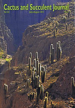 | On the cover: Crossing the Andes between Chile and Argentina is always an experience, with spectacular scenery, especially on the Argentinean side. In October 2010 Paul Klaassen used the Paso de Jama to cross from San Pedro de Atacama to Susques and drove on to Maimara. The last stretch leads down the Cuesta de Lipan, an excellent paved road, Ruta Nacional 52, that winds itself down the Andes from 4,170 metres (13,680 ft) above sea level at Abra de Potrerillos to 2,192 metres altitude (7,192 ft) at Purmamarca in the Province of Jujuy. There is a spectacularly diverse range of cacti to be found, as various taxa have found a niche habitat at different altitudes. Here the light helps to create a dramatic setting for a stand of Echinopsis (Trichocereus) atacamensis ssp. pasacana. |