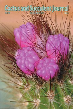 | On the cover: This specimen of Arrojadoa rhodantha was captured in bud by Jim Mauseth and is part of a teaching collection of cacti, succulents and other exotic plants located at the University of Texas in Austin. As with other arrojadoas, it grows cyclically. It first produces a vegetative shoot about 10 inches long with areoles that cannot flower. The shoot then produces several areoles tightly clustered together at the shoot's tip; these terminal areoles produce long red spines, then flowering branches emerge from among these spines. After a few weeks, the cycle begins again as a new vegetative shoot emerges from among the flowering areoles. |