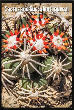 | On the cover: A seedling of Pediocactus sileri demonstrating strong growth of radial spines. The current season's growth is a fiery red, fading to black. The previous years' growth is light grey. Development of centrals will occur later on new tubercles as the plant matures. The plant pictured is about 1.25 inches in diameter. Pediocactus sileri is popularly known as the Gypsum Cactus, due to its preference for growing on substrates containing gypsum. Rob Skillin shows many other habitat examples in this issue's article on The Gypsum Cactus. |