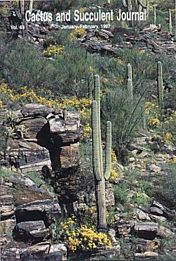 We thought you readers (especially if you are presently up to your knees in snow) would welcome a scene from a warmer clime. Spring in the desert is a wonderful thing to contemplate, especially if you can be there in person. For those who cannot, we present this view in Sabina Canyon, near Tucson, Arizona, where Carnegiea, Ferocactus, Fouquieria and two species of Opuntia are surrounded by yellow wildflowers. The talented photographer is Lindsey Martin of San Diego, California, and you will be seeing her work again on our covers; we are grateful to Michael Buckner for bringing her to our attention. |