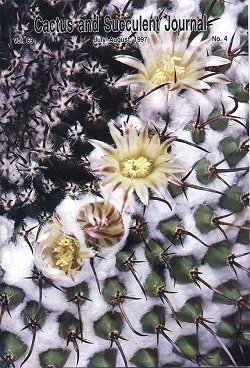 Mammillaria gigantea, from Mexico, is one of the most variable of mammillarias, its spines varying in number, length and color, while the flowers may range from pink to yellow. Our cover photo is of a short-spined, yellow-flowered form grown by Wendell (Woody) Minnich of Little Rock, California. We like this photo by John N. Trager because of its off-center orientation and because it depicts so many of the attractive features of the genus. |
