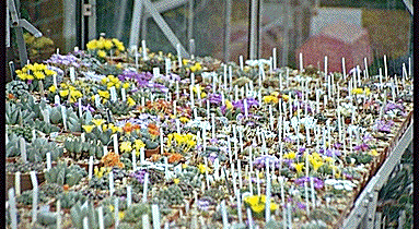 Group pages), and even a hardened cactophile such as myself has to admit they can be very attractive in the autumn when the cacti are lacking so many flowers. This photograph was taken in autumn last year and shows that amount of colour that can be packed into a small space. These plants are housed in a smaller greenhouse which is kept at only just above 32 degrees F (0 degrees C) in winter.