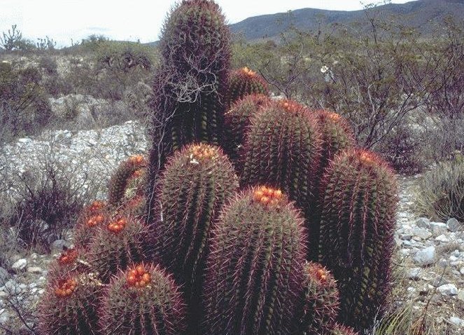 ![]() | Ferocactus stainesii (Hook) Br & R.This particular fine specimen of Ferocactus stainesii was found growing close to the roadside near Aramberri in Mexico. It was around 8 foot tall and the clump was over 10 foot in diameter. With its attractive red spines this species is deservedly popular. In cultivation in the UK the plants are quite slow and these habitat plants must be a great age. They need to be moderately large before they flower and our largest seedling plant which is about 7 inches in diameter has yet to oblige.A variety with additional wispy spines is known as Ferocactus pilosus. | 2