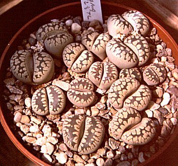 Lithops or living stones come from Southern Africa. Because of their small size, attractive marking and pretty flowers they are ideal subjects for a small greenhouse which enables them to be given the high light intensity they need. They are easily grown from seed which is readily available and will reach flowering size in 2-3 years in good conditions. If you would like to learn how to grow these interesting plants why not join the Mesemb Study Group. There are also a number of good books on the genus.