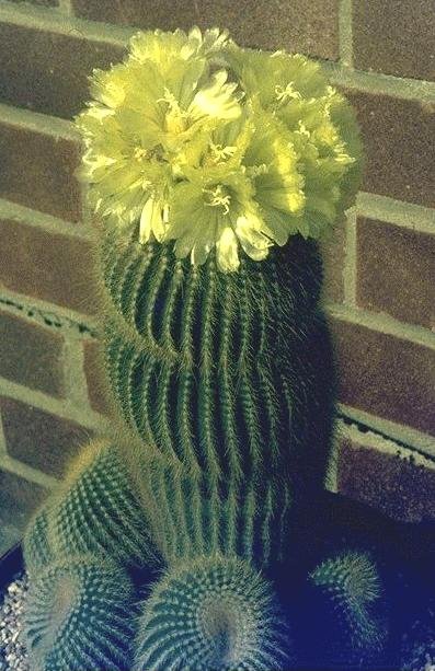 ![]() | Notocactus lenginghausii (K.Sch) BergerThis cactus is a very well known representative of the genus Notocactus. This species grows in Southern Brazil. It prefers a compost on the slightly acid side of neutral and plenty of water and food in the growing season. It eventually gets quite large forming clusters of heads. It flowers in summer, and contrary to some information does not need to be very large. The flowers remain open for several days and nights, unlike many cacti whose flowers only open during the day. The particular plant shown was in the collection of Suzanne and Tony Mace and was the plant from which the drawing on the front of the book on Notocacti, written by Tony Mace in 1975, was modeled. This plant was unfortunately lost (rotted) one winter due to being over-watered. A replacement of the same size (approximately 1 foot tall) has since been grown. |