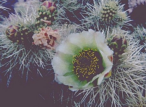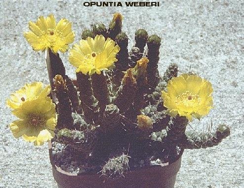 Opuntia weberi is quite widespread in mountainous areas of Salta and surrounding provinces in Argentina. It forms small clumps of usually very spiny short cylindric stems. In cultivation in needs a bright sunny position and a well drained compost. It will tolerate quite cold conditions in winter. There is a lot of variation in the spination of the species both in colour ranging from pure white to golden yellow and in length. Some clones have very long spines and are particularly attractive. The plant flowers relatively easily for us in the UK starting on plants in a 4 inch (10cm) pot. The particular clone illustrated here has rather short golden spines and the flowers are golden yellow |