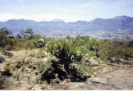 | Aloe plicatilis is a tree-aloe which grows slowly but can reach heights of 5 meters. This species is distributed only in the western Cape mountains. These pictures were taken in the reserve at Paarlrock, about 50 km North of Capetown on October 16,1996. It flowers from August until October and on the photos you can seen the inflorescens just coming out of the tops of the plants. Flowers are tubular and red. |